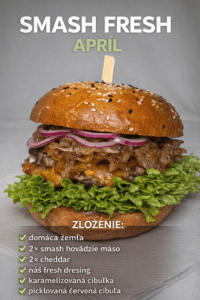 Smash Fresh burger/domáca žemľa, picklovaná červená cibuľa, karamelizovaná cibuľka, náš fresh dresing,…9,90 €+